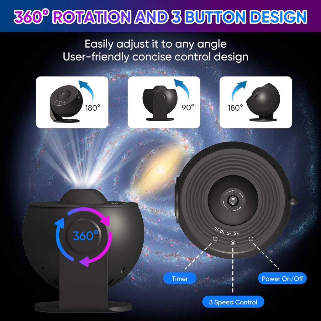 Rotation à 360° : Orientez facilement la projection vers le plafond, les murs ou le sol, créant ainsi un effet de ciel en mouvement qui captive petits et grands.